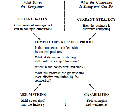 There are four diagnostic components to a competitor analysis (see Figure 3-1): future goals, current strategy, assumptions, and capabilities. ‘ Understanding these four components will allow an in-formed prediction of the competitor’s response profile, as articu–lated in the key questions posed in Figure 3-1. Most companies develop at least an intuitive sense for their competitors’ current strategies and their strengths and weaknesses (shown on the right side of Figure 3-1). Much less attention is usually directed at the left side, or understanding what is really driving the behavior of a com-petitor—its future goals and the assumptions it holds about its own situation and the nature of its industry. These driving factors are much harder to observe than is actual competitor behavior, yet they often determine how a competitor will behave in the future.