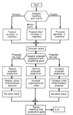 These rules define the output decision. In addition, the inventoryproduction part of the model exerts some pressures on other parts of the system. First, when goals are met, organizational slack is increased. Second, when goals are not met, pressure is put on the sales division to adjust sales to inventory-production needs — that is, to smooth sales by reducing them when proposed production is too high, and by increasing them when proposed production is too low.