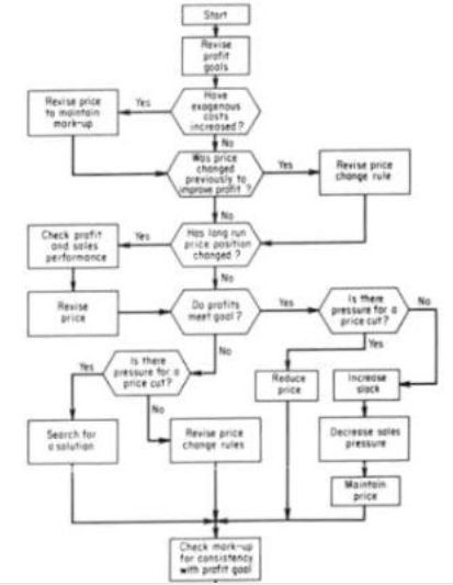 Finally, the department checks the consistency of its proposed price, anticipated costs, profit goal, and sales goal. That is, it asks whether the mark-up indicated by comparing price and unit cost will be large enough to meet the profit goal if the sales goal is achieved. If the answer is yes, the proposed price is confirmed. If the answer is no, the firm enters a special search routine. It considers whether it should cut costs or raise price in order to try to make mark-up consistent with goals. If it has most recently cut costs and that strategy succeeded, or if it has most recently raised price and that strategy failed, the department reduces costs by cutting slack and by reducing the sales promotion percentage.