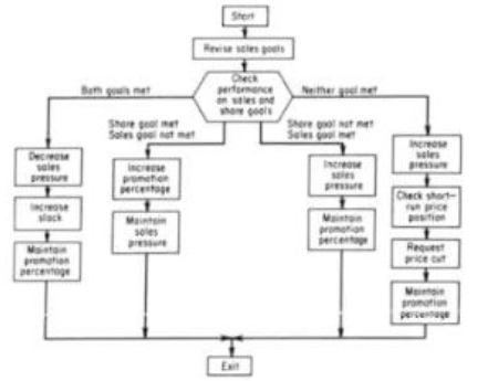 The firm then considers where it stands relative to its sales goals. If it is achieving either the market share goal, the sales goal, or both, no request for price action is transmitted to the pricing department. If both goals are being achieved, sales effectiveness pressure is reduced, slack is increased, and promotion expenditures are decreased.