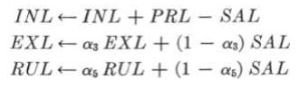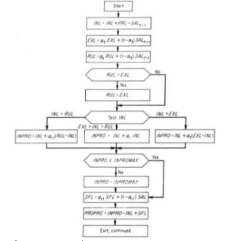 In order to determine proposed production, the inventory-production department determines a proposed inventory level ( INPRO ). First, inventory level ( INL ) is determined by a housekeeping operation — production is added and sales subtracted from the old inventory level to obtain the new one. Second, the program determines the external constraints on the inventory, the excess limit ( EXL ) and the runout limit ( RUL ) by taking a weighted average of the old limits and sales. Thus,