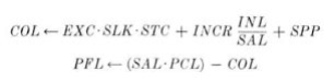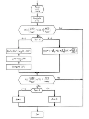 First, every λ PFT periods the firm revises its profit goal and the values of the weights in the profit goal functions. Every period the firm computes its total costs ( COL ) as a function of exogenous costs ( EXC ), slack, sales promotion percentage ( SPP ), and inventory costs ( INCR · INL / SAL ). It then computes a one-period profit level as a function of sales ( SAL ), price ( PCL ), and costs.