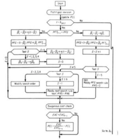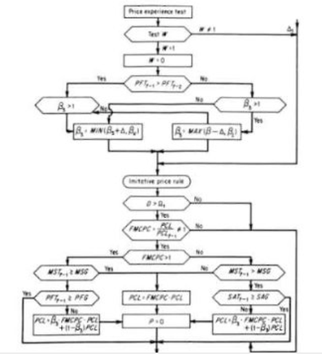 Third, every λ PFT periods the firm checks the results of past adjustments in price designed to improve the profit position. If price has been changed last period in response to a profit failure (see below), the firm asks whether profit has gone up. If it has, ß5 (the parameter controlling the amount of movement in prices) is revised to make future price movements more pronounced in the successful direction. If profit has decreased, ß 5 is revised so as to make future price movements less pronounced in the unsuccessful direction.