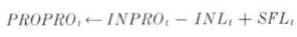 In order to determine proposed production, the inventory-production department determines a proposed inventory level ( INPRO ). First, inventory level ( INL ) is determined by a housekeeping operation — production is added and sales subtracted from the old inventory level to obtain the new one. Second, the program determines the external constraints on the inventory, the excess limit ( EXL ) and the runout limit ( RUL ) by taking a weighted average of the old limits and sales. Thus,