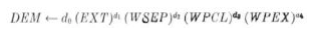 In each time period the total level of market demand (in physical units), which we call DEM, is the following function of the weighted average level of prices set by all firms ( WPCL ), the weighted average level of sales effectiveness pressure for all firms ( WSEP ), the weighted average level of sales promotion expenditures by all firms ( WPEX ), and an exogenous factor ( EXT ):