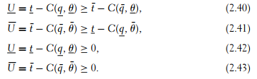 > 0 from the Spence-Mirrlees property, hence (2.51) is equivalent to q¯SB ≤ qSB. But from our assumptions we easily derive that qSB = q∗ > q¯* > q¯SB. So the Spence-Mirrlees property guarantees that only the efficient type’s incentive constraint has to be taken into account.