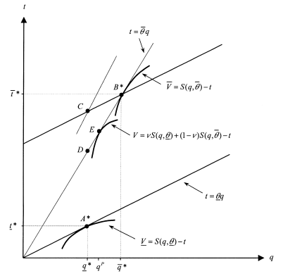 One possibility to restore incentive compatibility would be to distort q¯ down to q∗, which would decrease the θ-type’s information rent to yield contract D while still preserving incentive compatibility for both types. By this action we would obtain a pooling allocation at D. However, the principal can do better by choosing another pooling allocation, which is obtained by moving along the zero isoutility line of a θ¯-type. Indeed, the best pooling allocation solves problem (P) below: