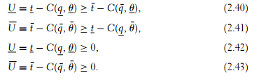 Following the same steps as in section 2.5, the incentive constraint of an efficient type in (2.40) and the participation constraint for the inefficient type in (2.43) are the two relevant constraints for optimization. These constraints rewrite respec- tively as