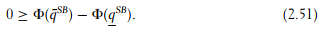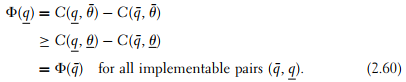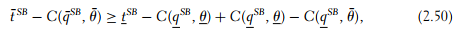 We have Φ‘ > 0 from the Spence-Mirrlees property, hence (2.51) is equivalent to q¯SB ≤ qSB. But from our assumptions we easily derive that qSB = q∗ > q¯* > q¯SB. So the Spence-Mirrlees property guarantees that only the efficient type’s incentive constraint has to be taken into account.