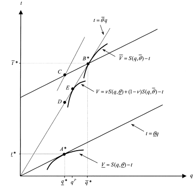 One possibility to restore incentive compatibility would be to distort q¯ down to q∗, which would decrease the θ-type’s information rent to yield contract D while still preserving incentive compatibility for both types. By this action we would obtain a pooling allocation at D. However, the principal can do better by choosing another pooling allocation, which is obtained by moving along the zero isoutility line of a θ¯-type. Indeed, the best pooling allocation solves problem (P) below:
