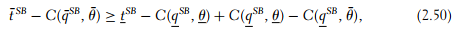 Remark: The Spence-Mirrlees property is more generally a constant sign condition on Cqθ. If Cqθ < 0, then Proposition 2.3 is unchanged except that now the inefficient type’s output is distorted upwards q¯SB > q¯* > q∗. Indeed, in such a model, the first-best production level of the inefficient type is higher than that level for the efficient type. Moreover, the information rent of the efficient type is still
