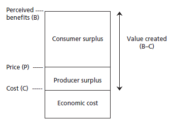Second, it is a view of value creation closely aligned with fundamental economic principles. Value is expressed in terms of the difference between perceived benefits, or customer willingness-to-pay, on the one hand, and economic costs on the other. This is, in essence, the same as the economic concept of total surplus, which equals the sum of the economic rents (pro- ducer surplus) and customers’ ‘value for the money’ or consumer surplus. The definition supports the notion that the value that an enterprise creates has the potential to enhance the welfare of all of its stakeholders. It is independent of the price of the product, though prices serve to allocate the surplus (see Figure 1.2).