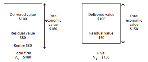In this scenario, product price determines how much of the economic value created by a firm is distributed to customers, in terms of benefits received over and above their cost to the consumer (price paid). If each firm delivers the same level of benefits to consumers, say $100, firm A will have a pool of residual value that exceeds that of firm B by $30 ($80−$50). What is residual value? It is what is left over after the consumers have been allocated a share of the total value. This is the share of total value that remains to be divided among other claimants, including the firm. In Figure 1.3, the residual value available to firm A is $80, while firm B has only $50 of total value left to allocate. Firm A has a positive differential in residual value of $30 ($80−$50). What does this positive differential in residual value represent? This, of course, is firm A’s competitive advantage over firm B, and it provides a protective cushion for A against competition from B.
