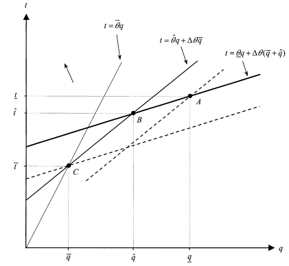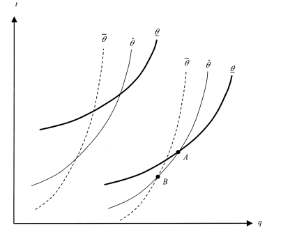 , which are also the slopes of the agent’s indifference curves, are increasing with the agent’s type. At point A, where the indifference curves of a θ-and a θ¯-type cross each other, the indifference curve of the θˆ-type has the greater slope; and at point B, where the indifference curves of a θˆ-type and a θ¯-type cross each other, the indifference curve of the θ¯-type has a greater slope.