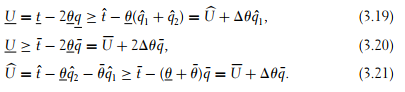To understand the origin of this bunching, let us first consider the case where the principal is concerned only with the upward incentive compatibility con- straints (3.19) and (3.21). With a strong correlation of types, the principal finds the information rent left to the (θ, θ)-type to be very costly because this type is relatively likely. Hence, the principal is led to reduce the output qˆ1 significantly. On the other hand, the intermediate type (θ, θ¯) is rather unlikely. Hence, the principal finds it not very useful to reduce the output q¯ to reduce the latter’s infor- mation rent. As a result, the schedule of outputs that would be implemented by the principal, had he taken into account only the downward incentive constraints, would be such that q¯ > qˆ1. The high output q¯ requested from a (θ¯, θ¯)-type makes the (θ, θ)-type willing to mimic the (θ¯, θ¯)-type rather than the intermediate type (θ, θ¯). With a strong correlation it is no longer correct to neglect the global incen- tive constraint (3.2). Both the local incentive constraints (3.19) and the global incentive constraints (3.2) are binding at the optimum, and this situation is only possible when the optimal allocation entails some bunching.