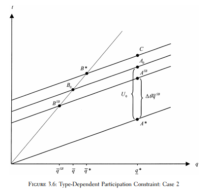 . The former solution is now no longer valid. To induce the efficient type’s participation, he must receive a higher level of utility than the information rent obtained in the optimal second-best contract corresponding to U0 = 0. Then, one can afford less distortion in the inefficient type’s production level and choose q¯ such that