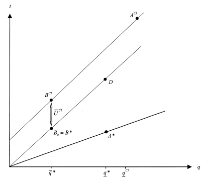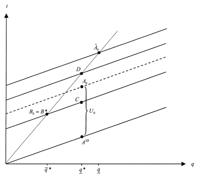 When U0 continues to increase (A0 is now above D), the inefficient type is now attracted by the allocation given to the efficient type, but the constraints (3.33) and (3.34) remain binding. As a result, the efficient agent’s output is distorted upwards to reach a value q, defined by