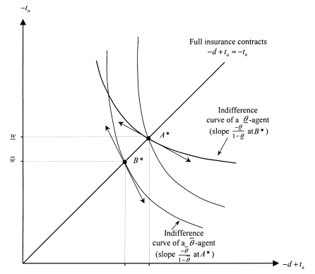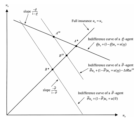 The contracts A∗ and B∗ are respectively offered to a θ– and a θ¯-agent under complete information. Instead, ASB and BSB are now offered to those agents under asymmetric information. The θ¯-agent is indifferent between ASB and BSB and thus weakly prefers the full insurance contract BSB. The θ-agent strictly prefers ASB to BSB but gets no information rent.