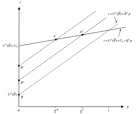 Consider a case where downsizing is large and the complete information downsizing entails excluding all the inefficient workers (contract B) and a propor- tion p∗ of efficient ones (contract A). Under incomplete information this requires giving up a rent BB’ to the inefficient type and creates countervailing incentives. In order to decrease this rent, p is increased to pCI (contracts (A”, B”).