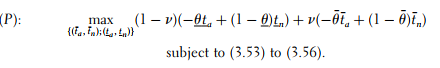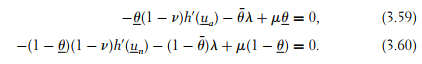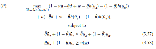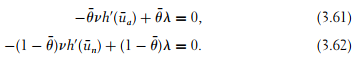 Let us denote the respective multipliers of (3.57) and (3.58) with λ and µ. Optimizing the Lagrangian of the principal’s problem with respect to ua and un yields, respectively,