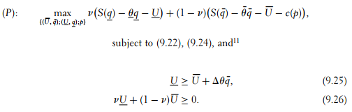 First, note that the principal incurs the cost of the judicial system. Specifically, we assume that the principal pays an amount X1 − gccXpc to maintain a judicial system of quality p. Second, the principal’s objective function takes into account the fact that the contract is always enforced on the equilibrium path when it is enforcement-proof. Hence, the punishment P is only used as an out-of-equilibrium threat to force the inefficient agent’s compliance. Of course, the maximal pun- ishment principle already seen in section 3.6 still applies in this context, and the constraint (9.24) is binding at the optimum.
