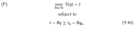where (9.40) is the agent’s participation constraint, which is obviously binding at the optimum because the principal wants to reduce the agent’s transfer as much as possible.
