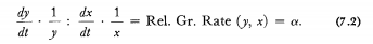 As can easily be seen, the allometric equation is a solution of this function which states that the ratio of the relative increase of variable y to that of x is constant. We arrive at the allometric relation in a simple way by considering that any relative growth —only presupposed it is continuous—can generally be expressed by: