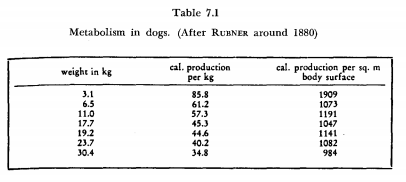 However, it is well known that historically the principle of allometry came into physiology in a way very different from the derivation given. It appeared in a much more special form when Sarrus and Rameaux found around 1840 that metabolic rate in animals of different body weight does not increase in proportion to weight, but rather in proportion to surface. This is the origin of the famous surface law of metabolism or law of Rubner, and it is worthwhile to take a look at Rubner’s original data of about 1880 (Table 7.1). In dogs of varying weight, metabolic rate decreases if calculated per unit of weight; it remains approximately constant per unit surface, with a daily rate of about 1000 kcal. per square meter. As is well known, the so-called surface law has caused an enormous debate and literature. In fact, Rubner’s law is a very special case of the allometric function, y representing basal metabolic rate, x body weight, and the exponent a amounting to 2/3.