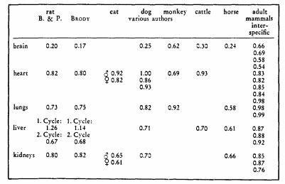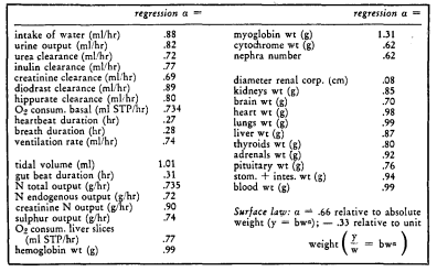Before leaving this topic, I would like to make another remark on principle. We have to agree that the allometric equation is, at best, a simplified approximation. Nevertheless, it is more than a convenient way of plotting data. Notwithstanding its simplified character and mathematical shortcomings, the principle of al- lometry is an expression of the interdependence, organization and harmonization of physiological processes. Only because processes are harmonized, the organism remains alive and in a steady state. The fact that many processes follow simple allometry, indicates that this is a general rule of the harmonization of processes (Adolph, 1949): “Since so many properties have been found to be adequately interrelated by equations of one form, it seems very unlikely that other properties would be related according to a radically different type of equation. For if they were, they would be incompatible with the properties reviewed.”