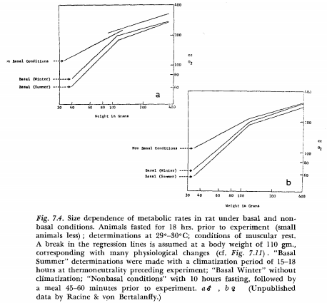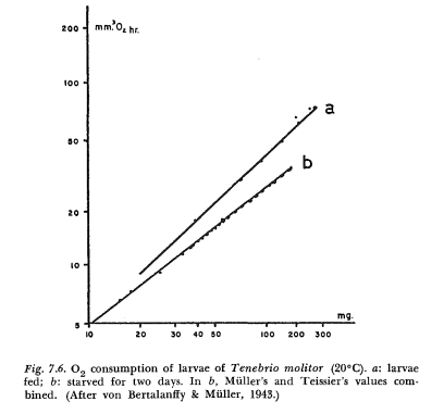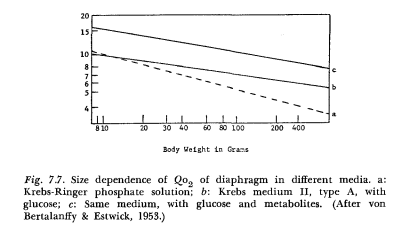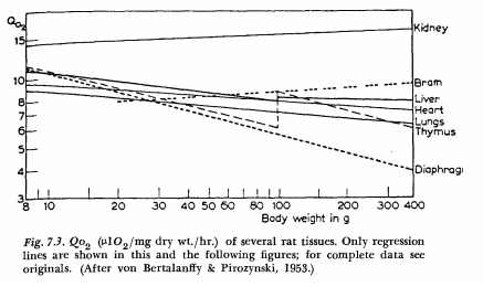 This is the reason why I doubt that total metabolism or B.M.R. can be obtained by so-called summated tissue respiration (Martin and Fuhrmann, 1955). Which Qo2 of the individual tissues should be summated? The Qo2 as obtained, say, in Ringer solution or that obtained with metabolites which may be twice as high? How do the different a’s of the various tissues add up to the 2/3 or 3/4 observed in B.M.R. of the entire animal? Similarly, Locker (1962) has shown that also the component processes of Qo2, such as carbohydrate and fat respiration, may have different regressions.