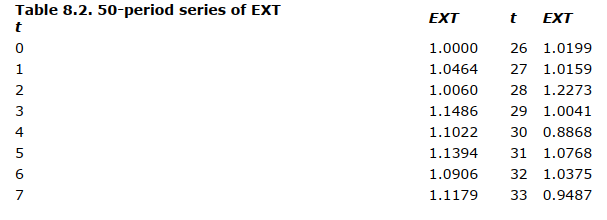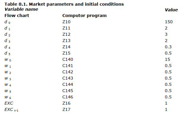 Industry and market simplifications. To study the impact of selected internal firm parameters on the model, we have simplified the industry by treating only the two-firm case. There are two firms in the industry, competing in the same market. There are no product differences between the two firms. In addition, we consider only one set of market parameters and a market in which the exogenous factor contributing to total demand ( EXT ) is subject only to modest random fluctuations around the mean. Values used for the market parameters and initial conditions are shown in Table 8. 1. EXT was normally distributed with a mean 1.0 and a standard deviation 0.1. Values of EXT were serially independent and are listed in Table 8.2.
