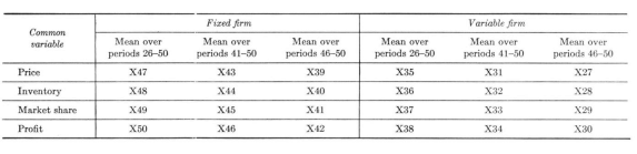 Output variables. For each of the two firms, we computed means of four different variables over three different time spans. Thus, we limited ourselves to 24 output variables. The four variables chosen were four common economic variables involved in the model — price, inventory, market share, and profit. The analysis considered the sensitivity of those variables to changes in internal parameter values. The time spans chosen were the last five time periods of the series, the last ten time periods of the series, and the last 25 time periods of the series. The total series consisted of 50 time periods. A complete listing of the output variables used in the analysis and their variable names in the computer program are indicated in Table 8.3.