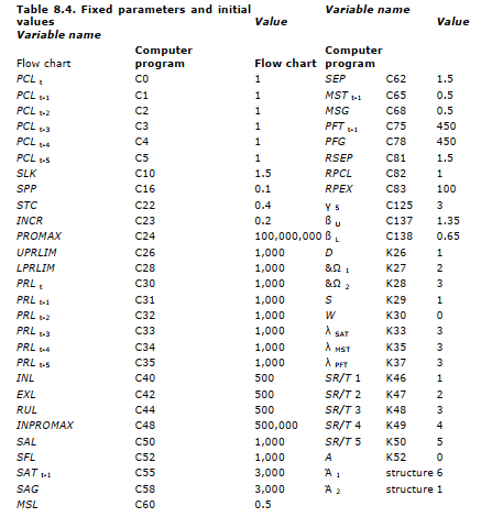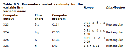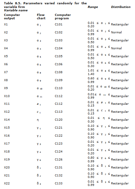 - From these distributions of parameter values we drew 100 random values for each of the 25 values. In effect, we created 100 different “firms” by a random combination of parameter values. The 25 variable names (in three forms — flow chart, internal computer program, and computer output), the ranges assigned, and the form of the distribution are indicated in Table 8.5. A check on the parameter values actually generated by the program indicates that the program did, in fact, choose values consistent with the specifications of range and form of distribution.