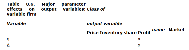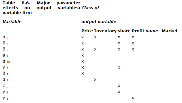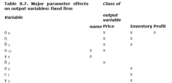 Parameters affecting the output of the fixed firm. For obvious reasons, the analysis of the output of the fixed firm is less interesting immediately and somewhat less easy to understand. The direct parameter effects in the model are prima facie effects on the variable firm. The analysis of their effects on the fixed firm presupposes a detectable interaction between the firms. The parameters affecting price, inventory, and profit levels are indicated in Table 8.7. The market share analysis, of course, is identical to the previous market share analysis in a two-firm industry.
