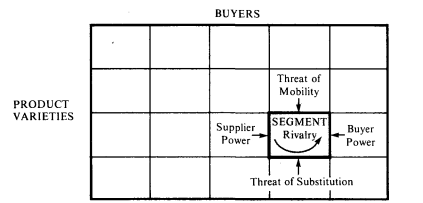 Structural Differences and Segmentation. Differences in products or buyers create industry segments if they alter one or more of the five competitive forces. Chapter 1 showed how the five competitive forces determine overall industry attractiveness. Structural analysis can also be applied to industry segments; the same five forces are at work. Economies of scale or supplier power, for example, can vary among product varieties even if they are sold to the same buyer. A given buyer may also possess differing propensities to substitute for different product varieties. Similarly, the power of buyers or the threat of substitution for the same product variety can differ from buyer to buyer. Figure 7-2 represents schematically how the five forces can vary by segment.5