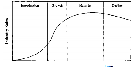 The grandfather of concepts for predicting the probable course of industry evolution is the familiar product life cycle. The hypothe-sis is that an industry1 passes through a number of phases or stages- introduction, growth, maturity, and decline—illustrated in Figure 8-1. These stages are defined by inflection points in the rate of growth of industry sales. Industry growth follows an S-shaped curve because of the process of innovation and diffusion of a new prod-uct.2 The flat introductory phase of industry growth reflects the dif-ficulty of overcoming buyer inertia and stimulating trials of the new product. Rapid growth occurs as many buyers rush into the market once the product has proven itself successful. Penetration of the product‘s potential buyers is eventually reached, causing the rapid growth to stop and to level off to the underlying rate of growth of the relevant buyer group. Finally, growth will eventually taper off as new substitute products appear.