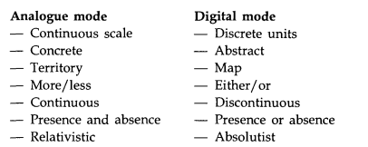 An illustration of the differences between the analogue and digital mode is presented in the following list of opposites:
