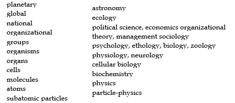 - All levels of systems have novel characteristics that apply universally upward in the hierarchy to more complex levels but not downward to simpler levels.