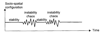 First comes a long period of stability followed by a short period of strong fluctuations or chaos. From there the systems re-emerges to a new level of structural stability and order in a sudden jump called bifurcation. With this move, the previous and alternate steady states cease to exist. It has been followed by reorganization with more complexity and less redundancy.