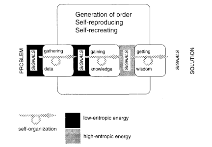 When the critical point is attained, the properties of the individual elements cease to matter and the interaction take over. Once started, the process generates order, making use of energy for performing work, depreciates it and removes the resulting entropy. See Figure 6.3.