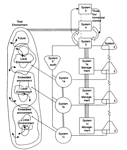 A viable system has the properties of self-repair, self-awareness, recursion and maintenance of identity. According to Beer the structure and working principles of a viable nervous system are applicable to all kinds of organizations for their regulation, adaptation, learning and development. When the performance is faulty, it is assumed that the cybernetic principles are being violated. Organizations exist in a very complex reality — ‘a terrible mess’ in the words of Beer. To handle their organization, managers have to tame the mess according to some basic principles presented in the model where the main concern is the control function and the concept of variety. The general solution to the problem of organizational complexity or variety is to use the fact that variety neutralizes variety. This is defined in the Law of Requisite Variety (see p.100) thus: the variety of the control unit has to be at least the same as the variety of the governed system. A massive variety reduction is possible through organizational recursion which implies that every systemic level is a recursion (organizational copy) of its metasystem.
