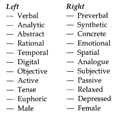 Within our Western-culture an old tradition of analytical and rational thinking is coupled with a need for adequate expressions in speech and writing. The capacity for artistic work, intuitive thinking and creative fantasy is often seen as something less essential for both personal and societal development. From that point of view the left side dominates, sometimes creating the typical modern rational personality (sometimes with a touch of neurosis). For a harmonious development of the personality, society and its educational system must assign equal significance to the capacity of both left and right brain halves.