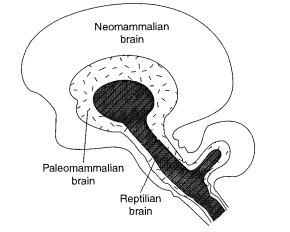Besides the PDP-brain model, several others are well-known. Especially relevant here is the triune concept of the brain presented by Paul MacLean in 1972. According to this theory, the brain is organized in three main hierarchical layers, arranged with the oldest in the centre surrounded by the others, like the skins of an onion. The human brain is a complicated web of these layers superimposed on to each other according to the different evolutionary stages. It is reminiscent of a thousand-year-old town where old and new buildings exist side by side. Each of us thus carries the history of the whole biological evolution in our nervous system. The three main stages are presented in Figure 5.1.
