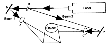 A holographic photograph is created by use of a laser light split into two beams. One beam shines directly on the film while the other is reflected from the object to be photographed. Unlike ordinary photographs, the result is a blur covering the whole negative. This blur is a kind of interference pattern and when a laser beam is projected through the negative, the object reappears at a certain distance away from it. Different parts of the object are brought into focus by changing the viewing position (see Figure 5.6).