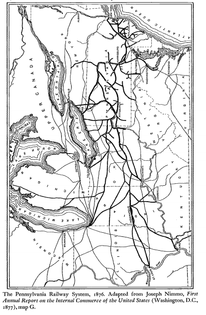 These plans called for obtaining access to the major commercial centers and the natural resources—coal, oil, and lumber—in the nation’s heartland between New York and Philadelphia and Chicago and St. Louis.9 The Pennsylvania leased or purchased control of roads into Columbus, Cin- cinnati, Indianapolis, Louisville, Maysville, and Cairo. Simultaneously it purchased control of lines to the lake ports and the lumber region of Michigan. Then in 1871 it leased for 999 years the “Joint Companies” in New Jersey in order to insure absolute control of the routes from Philadelphia and other Pennsylvania rail centers into New York City.10 It soon had its own lines into Buffalo and Toledo, as well as Detroit and Chicago, and its connections to Washington and Baltimore. In less than five years the Pennsylvania had grown from a line of 491 miles of track to one of just under 6,000 miles, or 8 percent of the total mileage of railroads operated in the United States. Its capitalization stood at just under $400,000,000, a fraction less than 13 percent of the total capital invested in American railroads. By 1874 the total mileage it directly administered equaled that of the railroad network of Prussia. Only two nations in the world, Great Britain and France, had more miles of railroad than the Pennsylvania system.