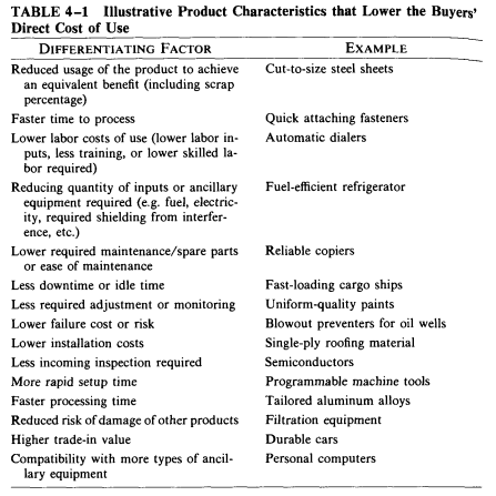 - Lower the indirect cost of using the product, or the impact of the product on other value For example, a light component may reduce the transport costs of the end product