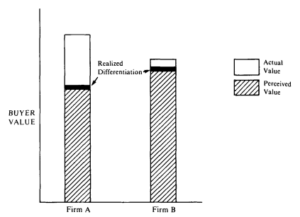 A buyer’s incomplete knowledge implies that the differentiation actually achieved may well be based in part on the factors used by the buyer to infer or judge whether a firm will lower its cost or improve its performance relative to competitors (or is doing so cur rently). Buyers use such indications as advertising, reputation, packag ing, the professionalism, appearance, and personality of supplier employees, the attractiveness of facilities, and information provided in sales presentations to infer the value a firm will or does create. I term such factors that buyers use to infer the value a firm creates signals of value.