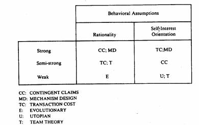 The world of contract is variously described as one of (1) planning, (2) promise, (3) competition, and (4) governance (or private ordering). Which of these descriptions is most applicable depends on the behavioral assumptions that pertain to an exchange and on the economic attributes of the good or service in question. As developed more
