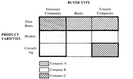 Firms can choose different groups of segments on which to focus, which may or may not overlap. Figure 7-10 illustrates a case where a number of firms are supplying information products to financial services firms. Company A has adopted a product-based focus strategy of supplying one product variety (data bases) to all buyers. Company B, on the other hand, has adopted a buyer-based focus strategy in which it sells the full array of products to insurance companies. Com pany C has yet another focus strategy which concentrates exclusively on providing consulting advice to finance companies. Its buyers either acquire the data elsewhere or generate it themselves. Company C’s focus strategy does not overlap with the segments served by companies A and B.