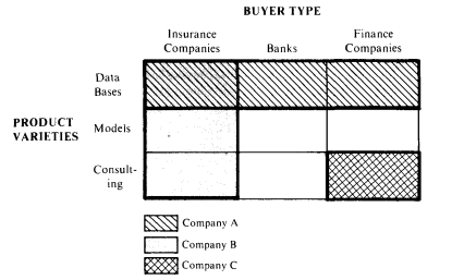 Firms can choose different groups of segments on which to focus, which may or may not overlap. Figure 7-10 illustrates a case where a number of firms are supplying information products to financial services firms. Company A has adopted a product-based focus strategy of supplying one product variety (data bases) to all buyers. Company B, on the other hand, has adopted a buyer-based focus strategy in which it sells the full array of products to insurance companies. Company C has yet another focus strategy which concentrates exclusively on providing consulting advice to finance companies. Its buyers either acquire the data elsewhere or generate it themselves. Company C’s focus strategy does not overlap with the segments served by companies A and B.12